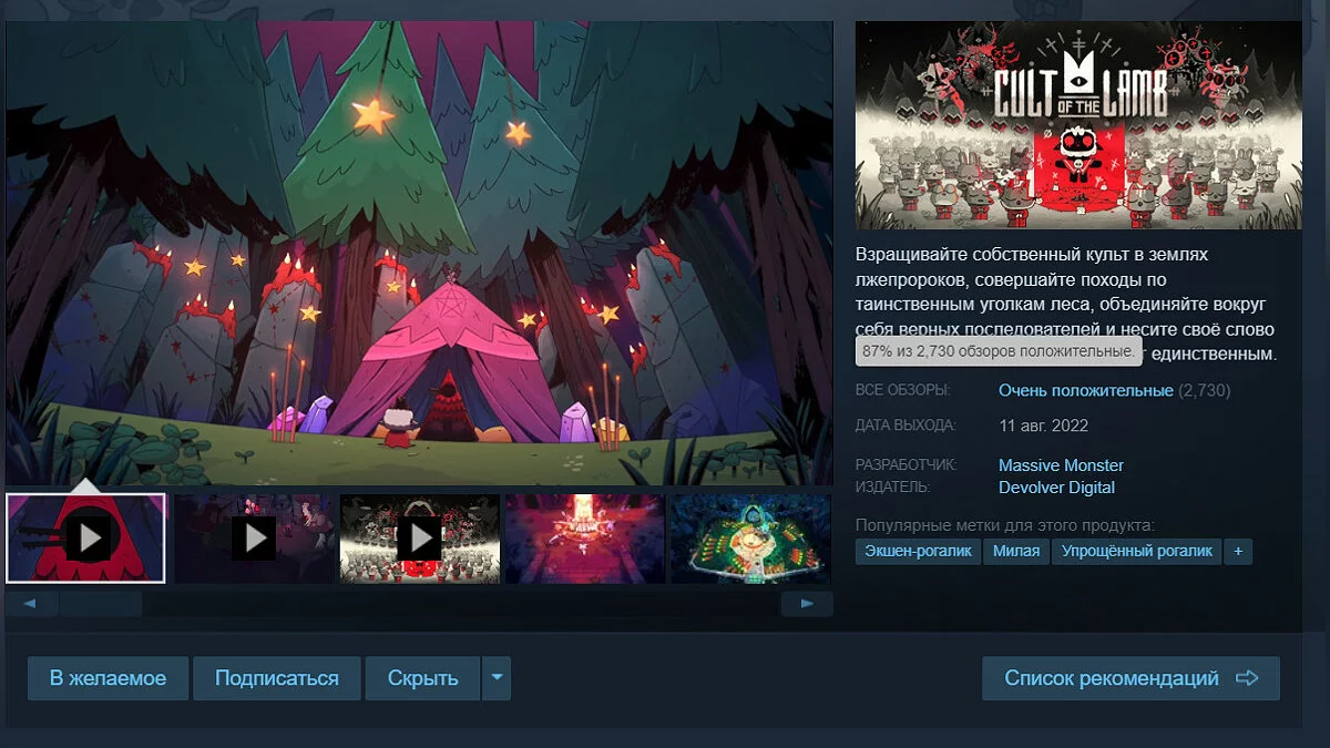 На момент написания материала рейтинг Cult of the Lamb составляет 87%.