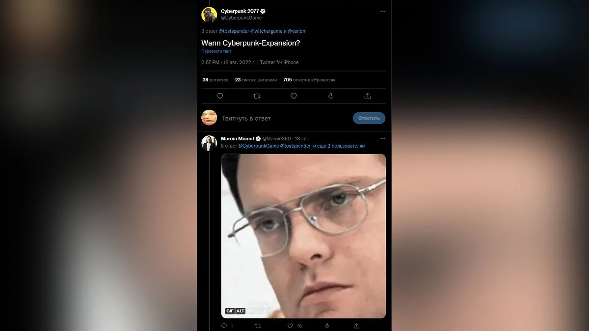 Под постом CDPR отметился глава по работе с сообществом Марчин Момот (Marcin Momot). Поскольку текст «Когда дополнение для Cyberpunk?» написан на немецком, есть вероятность, что анонс случится уже на церемонии открытия Gamescom 2022.