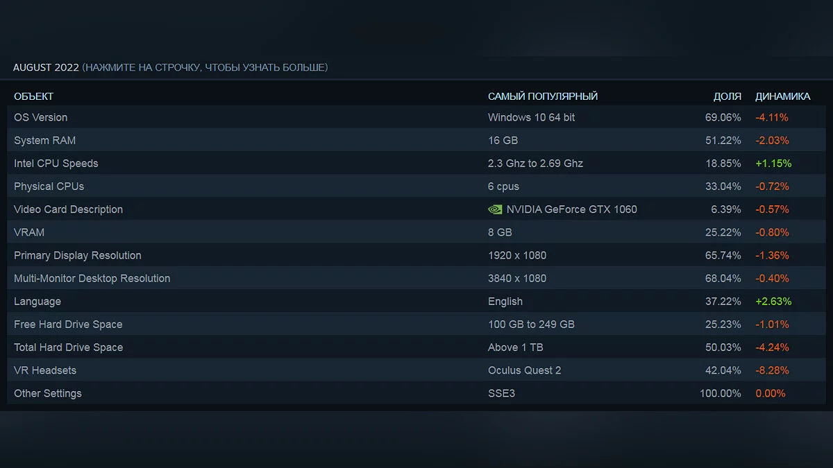 В сервисе Steam появилась данные об оборудовании, которое геймеры использовали в августе. Количество пользователей с Windows 10 (64-бит) продолжает уменьшаться — растёт популярность 11-й версии ОС. NVIDIA GeForce GTX 1060 до сих пор удерживает лидирующую позицию среди всех видеокарт.