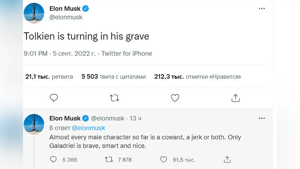 «Толкин переворачивается в гробу. Пока что почти каждый мужской персонаж — трус, идиот или и то, и другое вместе взятое. Только Галадриэль — смелая, умная и милая», — написал Илон Маск в своих социальных сетях.