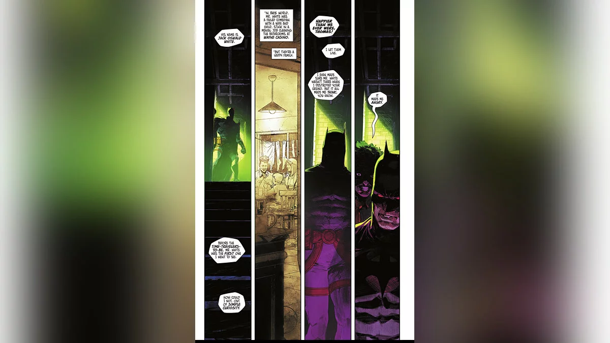 По словам Марты, в этой вселенной Джокер семьянин, работающий в казино Уэйнов и беспокоящийся о своих жене и ребенке. Несмотря на бедность, Джек Освальд Уайт чувствует себя счастливым и никогда не подвергался таким травмам, как, к примеру, в комиксе «Бэтмен. Убийственная шутка».