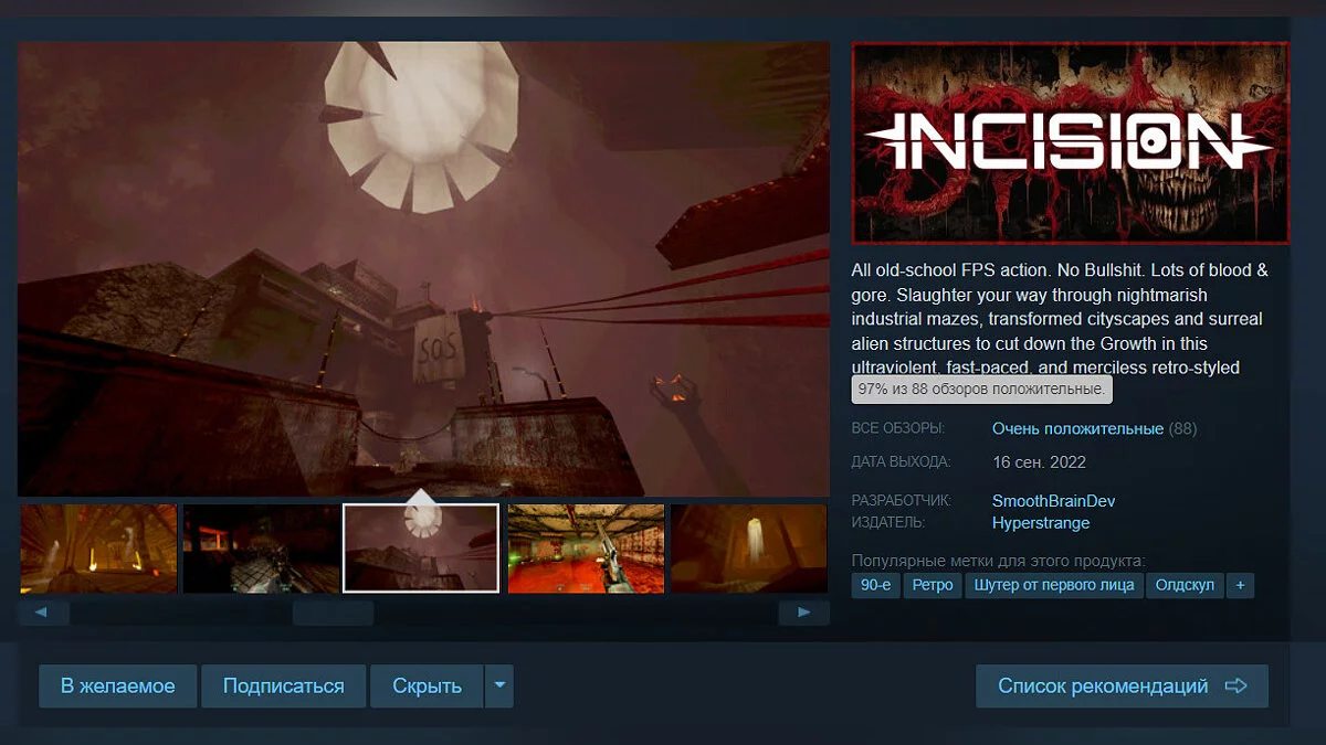 На днях в раннем доступе Steam вышел брутальный шутер от первого лица под названием INCISION, который на момент написания новости имеет очень положительные отзывы от геймеров (рейтинг 97%).