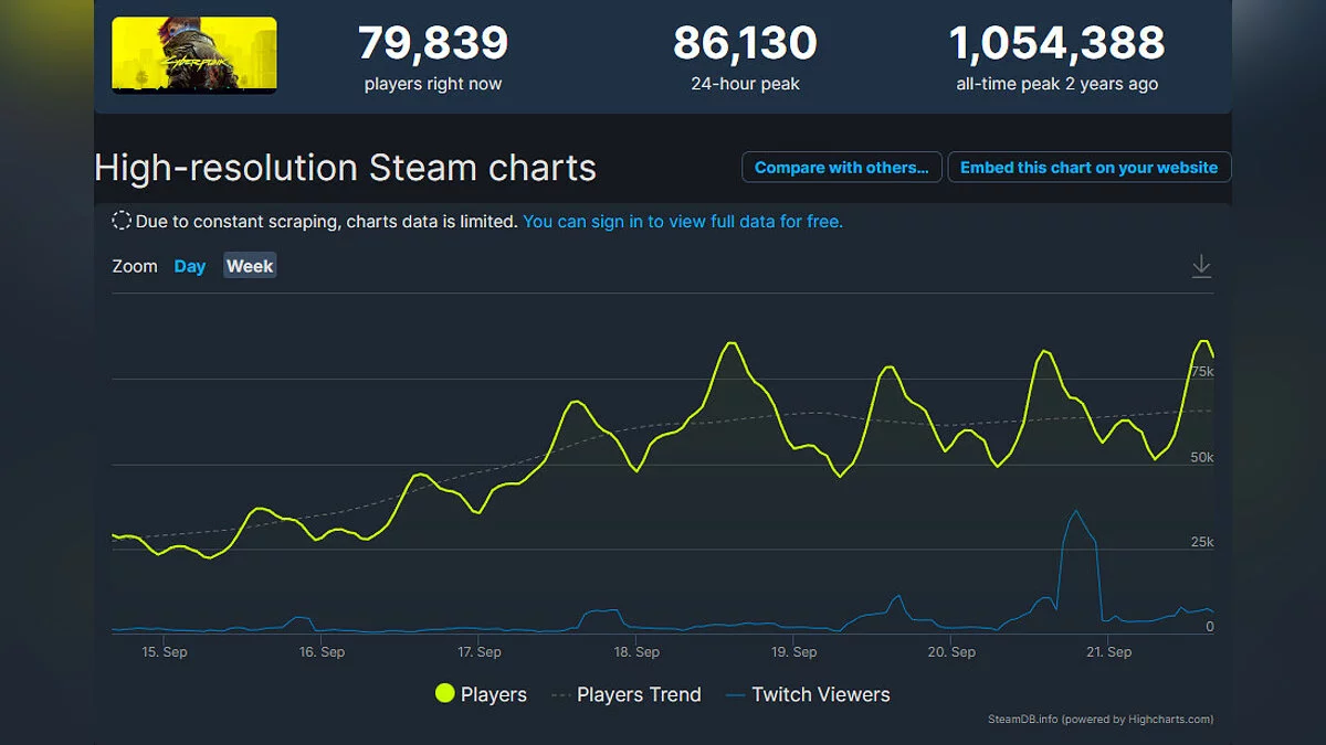 Успех аниме-сериала «Киберпанк: Бегущие по краю» (Cyberpunk: Edgerunners) пробудил у геймеров интерес к Cyberpunk 2077. Ролевая игра вернулась в десятку самых популярных проектов в сервисе Valve. За последние сутки в пике онлайна в Steam в ней находились одновременно чуть больше 86 тысяч человек.