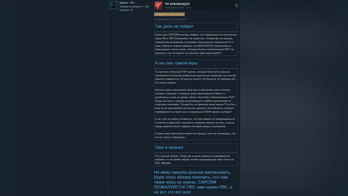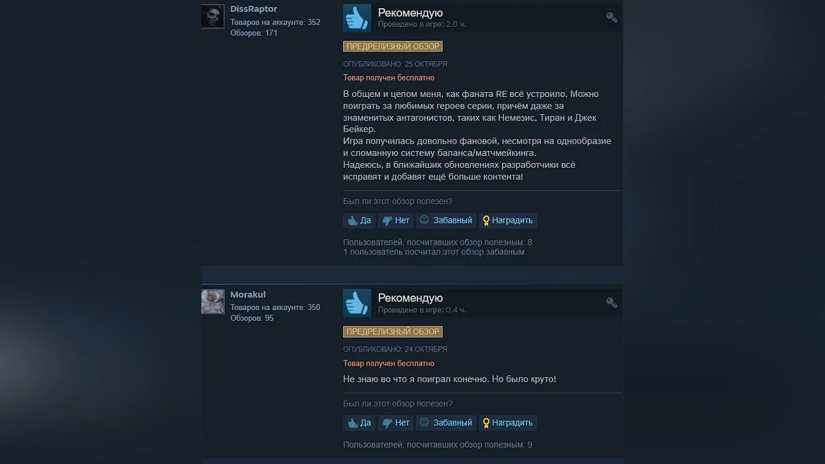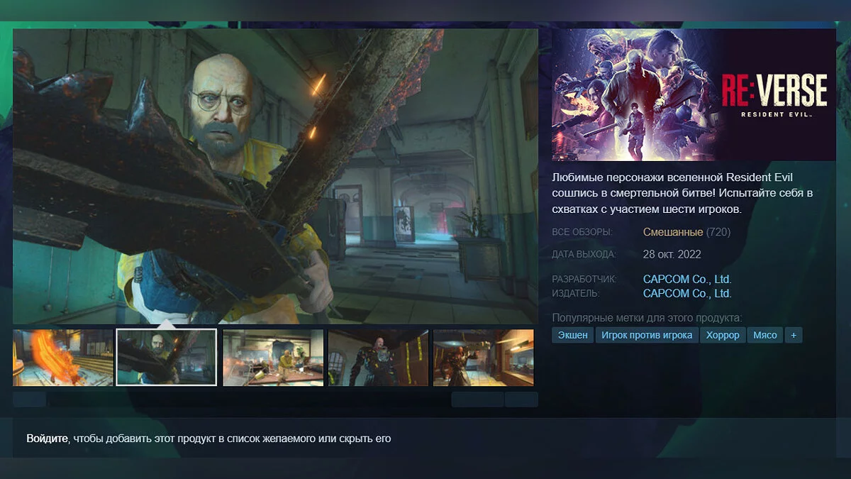 Недавно в раннем доступе появилась Resident Evil Re:Verse — многопользовательская PvP-игра, в которой знаменитые персонажи серии должны сойтись в смертельном бою. Игра уже успела получила первые отзывы от геймеров в Steam. Они оказались смешанными. Так, к примеру, на момент написания новости рейтинг проекта составляет всего 48%.