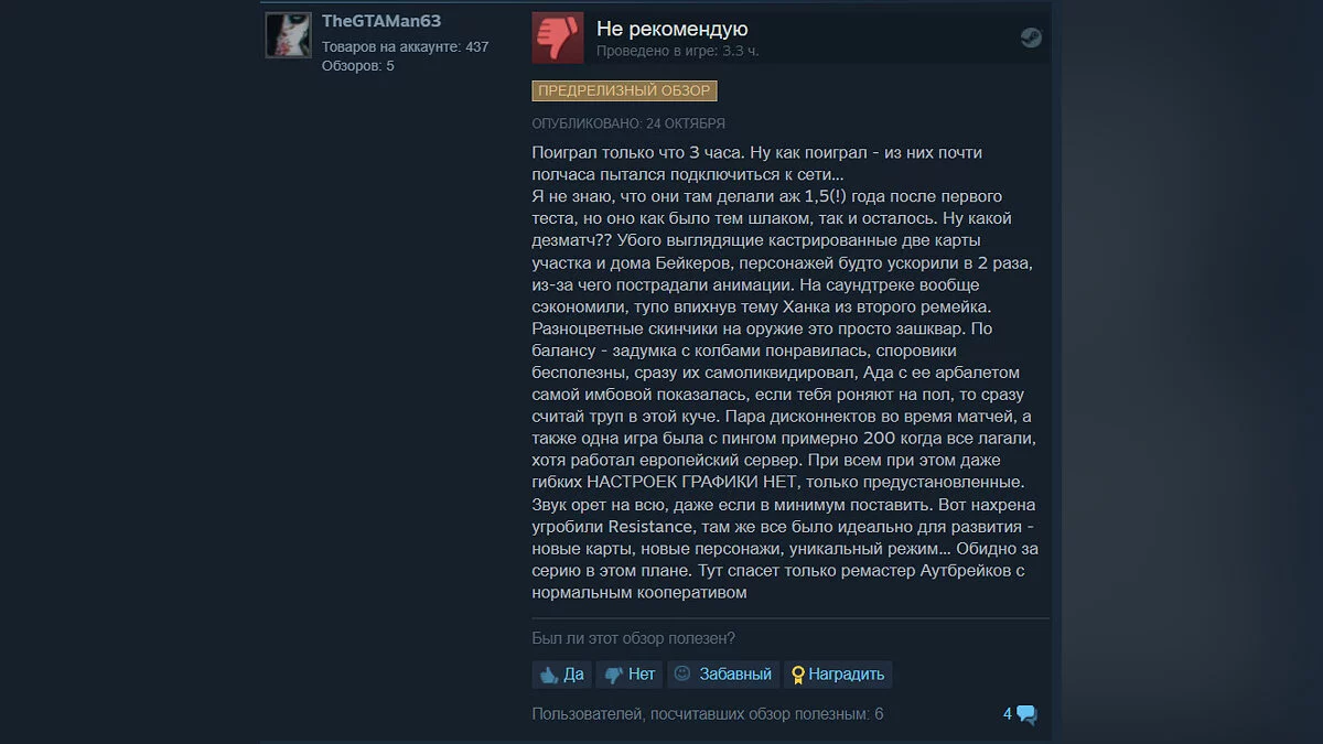 Среди минусов геймеры в основном выделяют долгое время подключения, плохие по качеству анимации и дисбаланс в PvP. Но при этом многие игроки отмечают, что проект все равно получился лучше, нежели кооперативный шутер Resident Evil: Resistance.