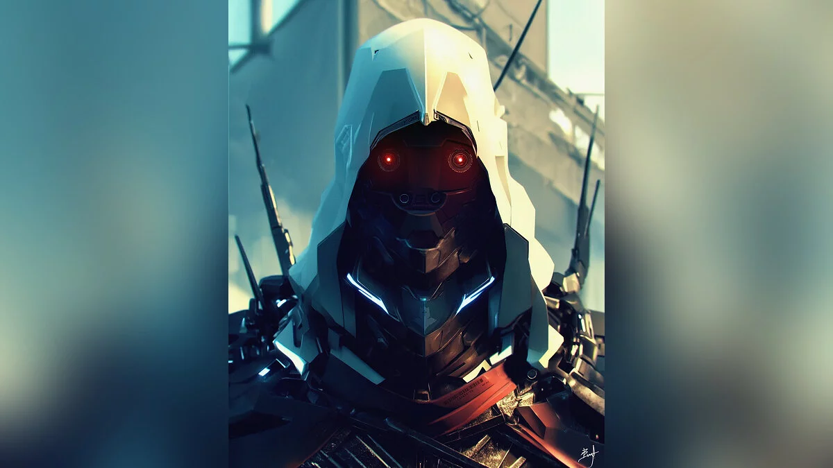 В создании иллюстрации автору помог искусственный интеллект Stable Diffusion. Ассасин из будущего выглядит в виде робота с красными глазами и в классическом капюшоне.