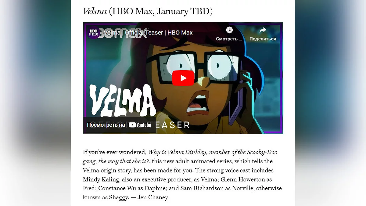Похоже, премьера спин-оффа «Скуби-Ду» про Велму Динкли с рейтингом 18+ состоится в январе 2023 года. Такой информацией поделилось известное зарубежное издание Vulture. Пока новость стоит воспринимать как слух.