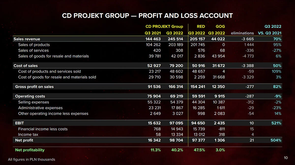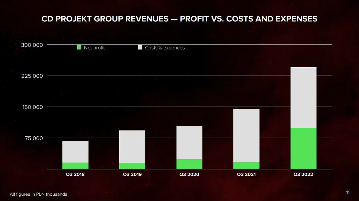 Выручка CD Projekt RED выросла на 70% по сравнению с третьим кварталом прошлого года и составила $54,4 млн. Чистая прибыль выросла на 504% и составила $21,9 млн. Прибыль GOG за третий квартал — $291 тысяча.