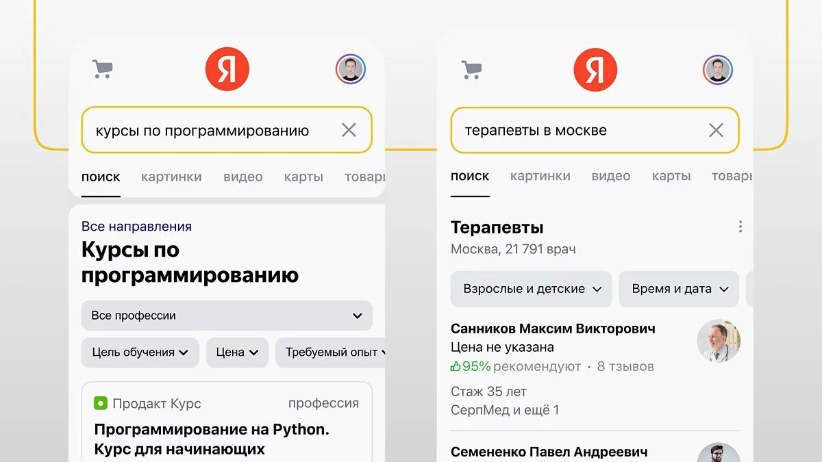 «Яндекс» представил обновлённую версию поиска под названием Y2, который стал более точным. К примеру, при поиске врача система выдаёт перечень специалистов с указанием стоимости приёма и графика работы. То же самое актуально для поиска товаров и онлайн-курсов.
