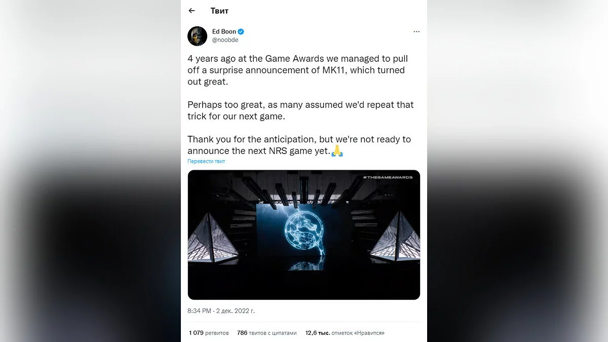 Эд Бун (Ed Boon), глава NetherRealm Studios, сообщил, что студия не покажет новую игру на The Game Awards 2022. Она просто не готова это сделать.