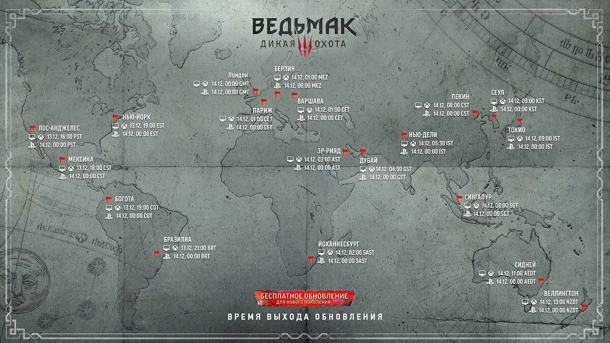 На карте указаны крупные города и время, когда станет доступен патч. Для российских игроков на PC и Xbox он выйдет в полночь по гринвичскому времени (или в три часа ночи по МСК), а для владельцев PlayStation — в полночь по местному времени.