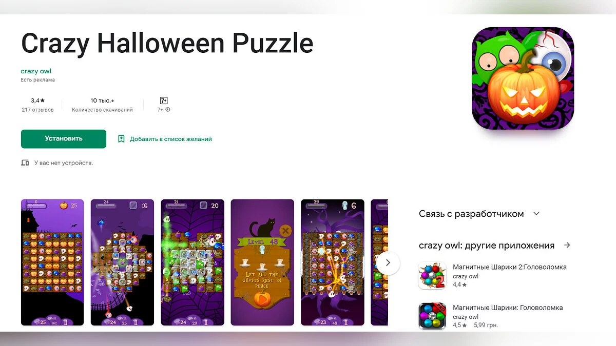 - Crazy Halloween Puzzle — классическая головоломка «три в ряд» на тему Хэллоуина (загрузить бесплатно).