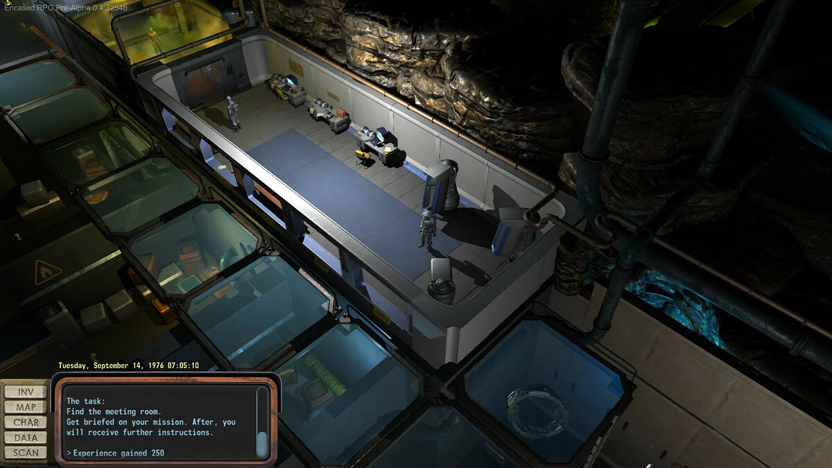 Encased представляет собой тактическую изометрическую RPG с открытым миром и пошаговыми боями, вдохновлённую культовыми Fallout, Wasteland и Shadowrun. События ролевой игры разворачиваются в альтернативных 70-х годах, а сюжет рассказывает о рядовом сотруднике корпорации CRONUS, который отправился исследовать найденный в пустыне огромный аномальный объект — Купол, созданный неизвестной цивилизацией.