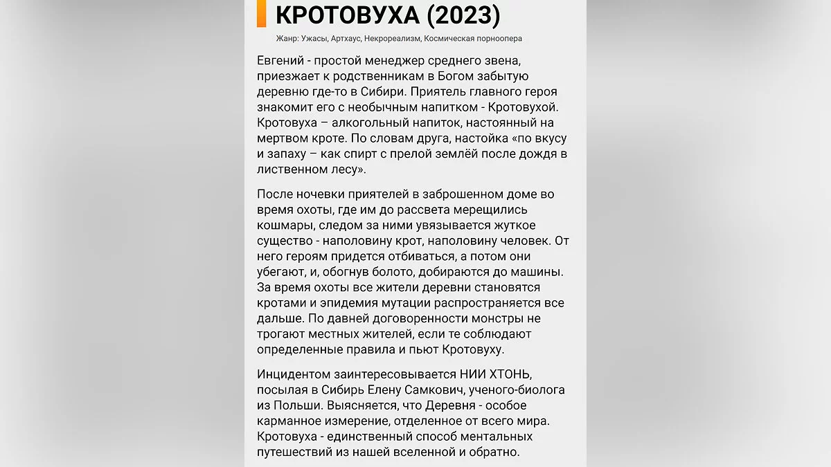 Сюжет фильма под названием «Кротовуха» рассказывает о менеджере по имени Евгений, который с друзьями приезжает на охоту в сибирскую деревню. Однако там они сталкиваются с жуткими событиями — на них самих нападает получеловек-полукрот, а в деревне начинается эпидемия. Единственным средством от болезни является напиток «Кротовуха».