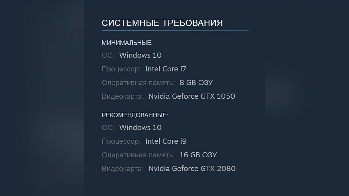 Игра не переведена на русский язык (доступен только английский). Хотя проект не может похвастаться крутой графикой, для его запуска, судя по странице в Steam, потребуется Windows 10, процессор Intel Core i7, видеокарта NVIDIA GeForce GTX 1050 и 8 ГБ ОЗУ. А для максимальных настроек и вовсе нужен компьютер с Intel Core i9, NVIDIA GeForce GTX 2080 и 16 ГБ ОЗУ.