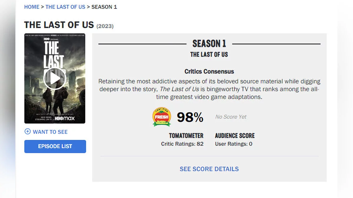 Завтра, 15 января, стартует сериал «Одни из нас» (The Last of Us). Но журналисты уже успели посмотреть его и выставить оценки. Как сообщается, на Rotten Tomatoes проект компании HBO установил своеобразный рекорд.
