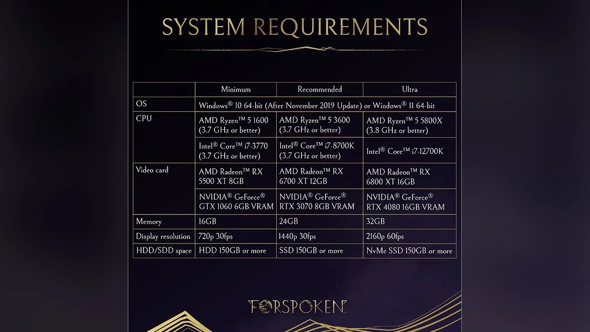 Компания Square Enix опубликовала системные требования PC-версии ролевого экшена Forspoken. Системки оказались неожиданно высокими. Для запуска игры в 720p с 30 FPS потребуются как минимум Intel Core i7-3770, NVIDIA GeForce GTX 1060, 16 ГБ оперативной памяти и 150 ГБ свободного места на SSD/HDD.