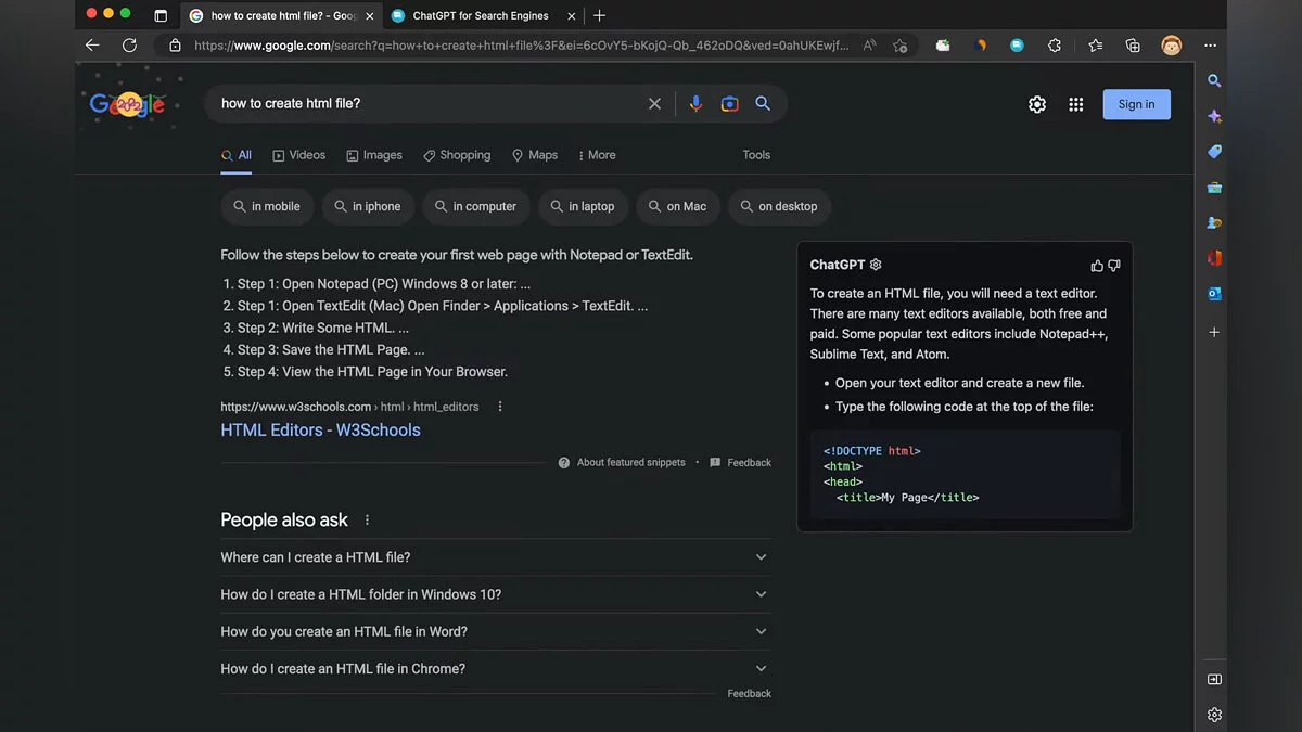 На видео ниже показано, как это работает на примере запроса: «Как создать HTML-файл?».