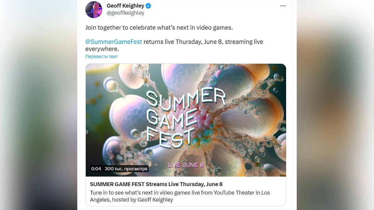 «Summer Game Fest возвращается в прямом эфире в четверг, 8 июня», — написал Джефф Кейли в социальных сетях.