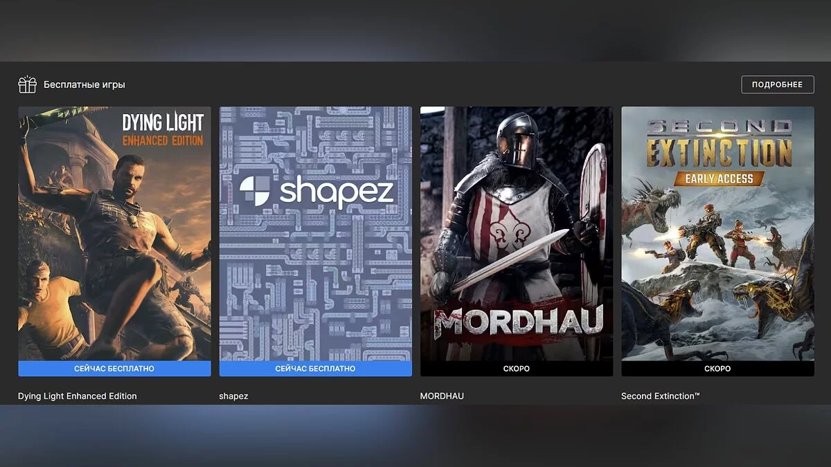 В Epic Games Store началась бесплатная раздача двух новых игр: зомби-экшена Dying Light — Enhanced Edition и симулятора строительства фабрики shapez. Акция по традиции продлится всего неделю и закончится 13 апреля в 18:00 МСК.