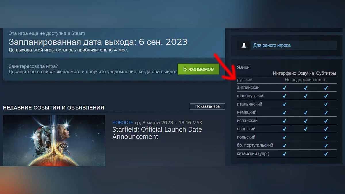 Вчера (11 апреля) на страничке Starfield в Steam произошло небольшое изменение — исчезло упоминание русской локализации, включая субтитры и интерфейс.