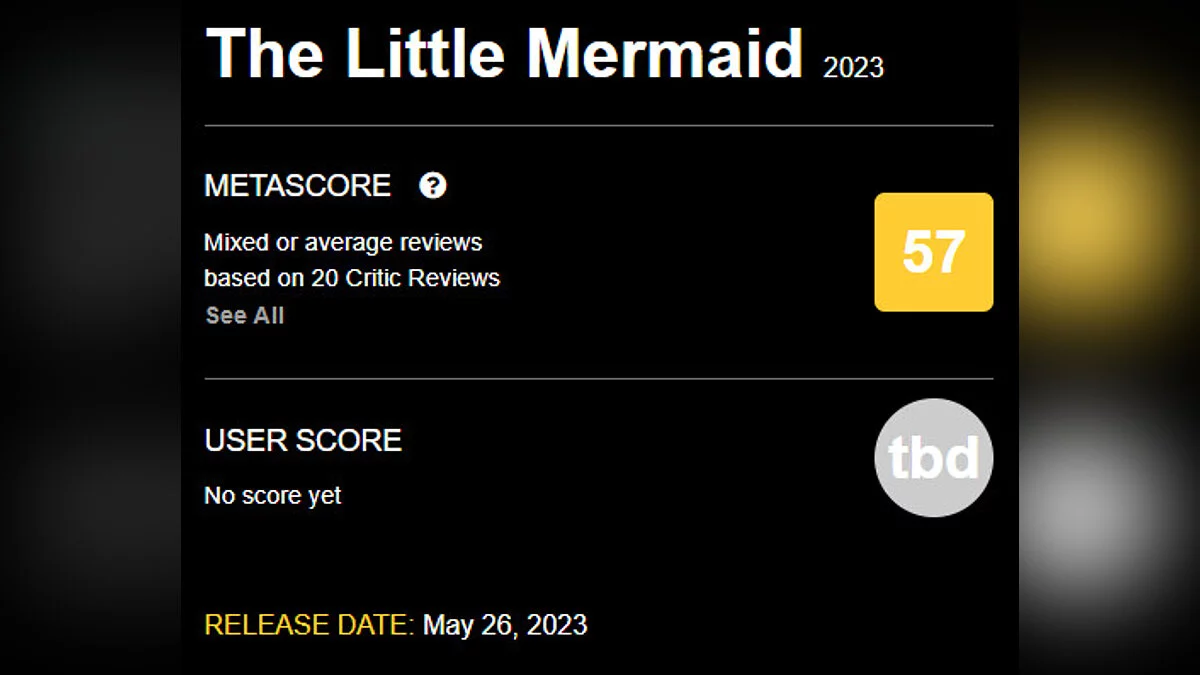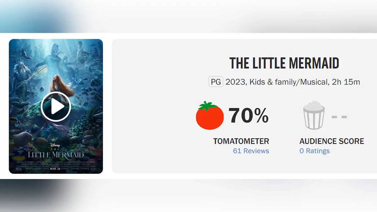 Компания Disney сняла эмбарго на публикацию обзоров новой «Русалочки». Фильм получил 70% «свежести» на Rotten Tomatoes, а его средний балл на Metacritic составил 57/100.