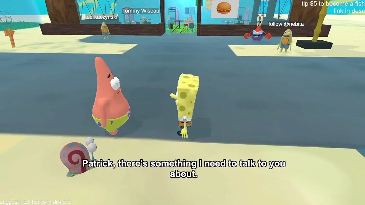 В ходе трансляции персонажи путешествуют по Бикини Боттом, оказываются в неприятностях и общаются друг с другом на самые разные темы. Голоса при этом взяты из мультсериала.