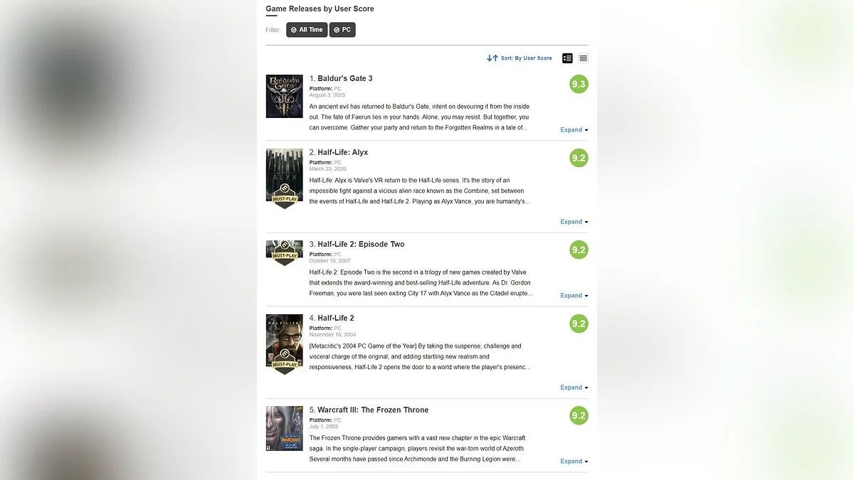 Но что самое интересное, Baldur's Gate 3 также возглавила пользовательский топ лучших ПК-игр за всю историю. Пользователи Metacritic оценили новинку выше, чем культовые Half-Life 2 и Warcraft 3: The Frozen Throne.