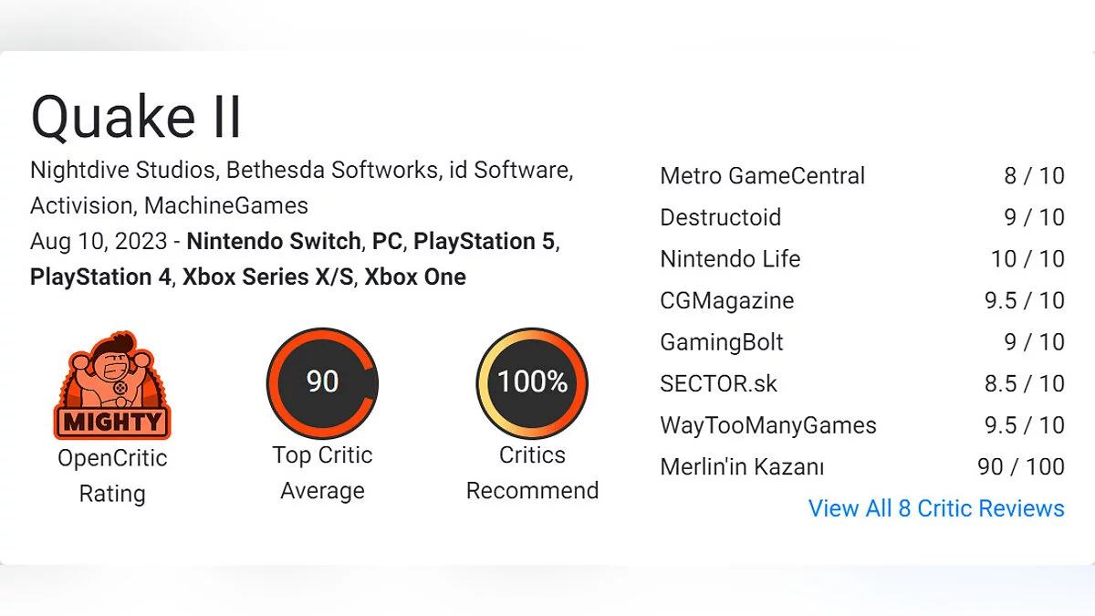 Спустя несколько дней после выхода ремастера Quake 2 в сети начали появляться первые обзоры. Обновлённая версия культового шутера привела в восторг критиков — средняя оценка проекта равна 90/100 баллов на OpenCritic. В Steam, к слову, она получила 93% положительных отзывов.