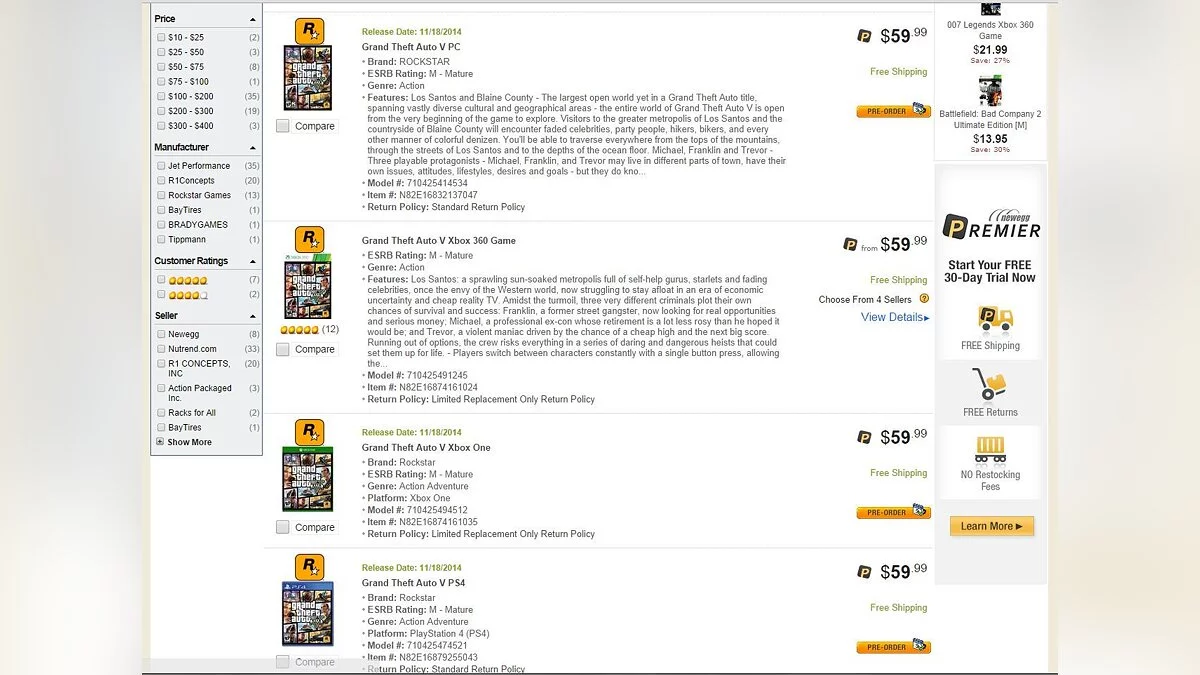 По информации Newegg, игра выйдет на новых платформах 18 ноября этого года. А вот Amazon считает, что GTA 5 выйдет на PC, Xbox One, PS4 четырьмя днями ранее — 14 ноября.