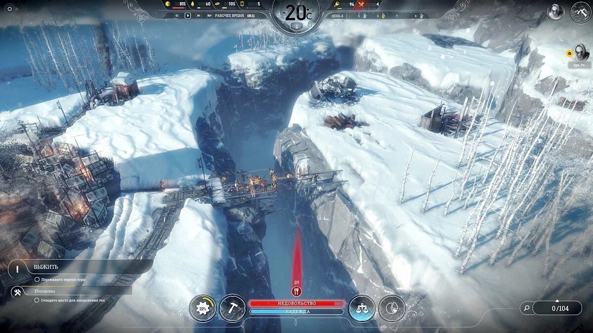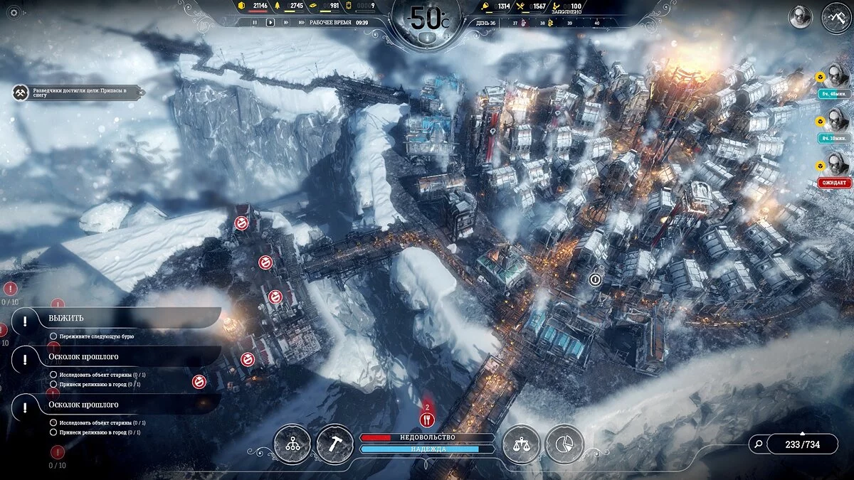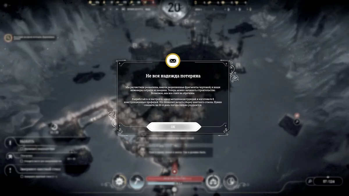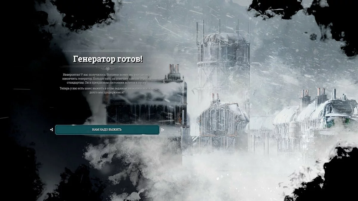 Сама идея для бесконечного режима хорошая — мы начинаем посреди зимы, неожиданно для всех генератор взрывается... Пакет чертежей на старте, жизнь без отопления, сильные морозы и необходимость расширять город, пока идет процесс строительства. Игроку предстоит нащупать путь, как из всего этого выбраться и успеть до бури. Красивая задача, согласитесь.