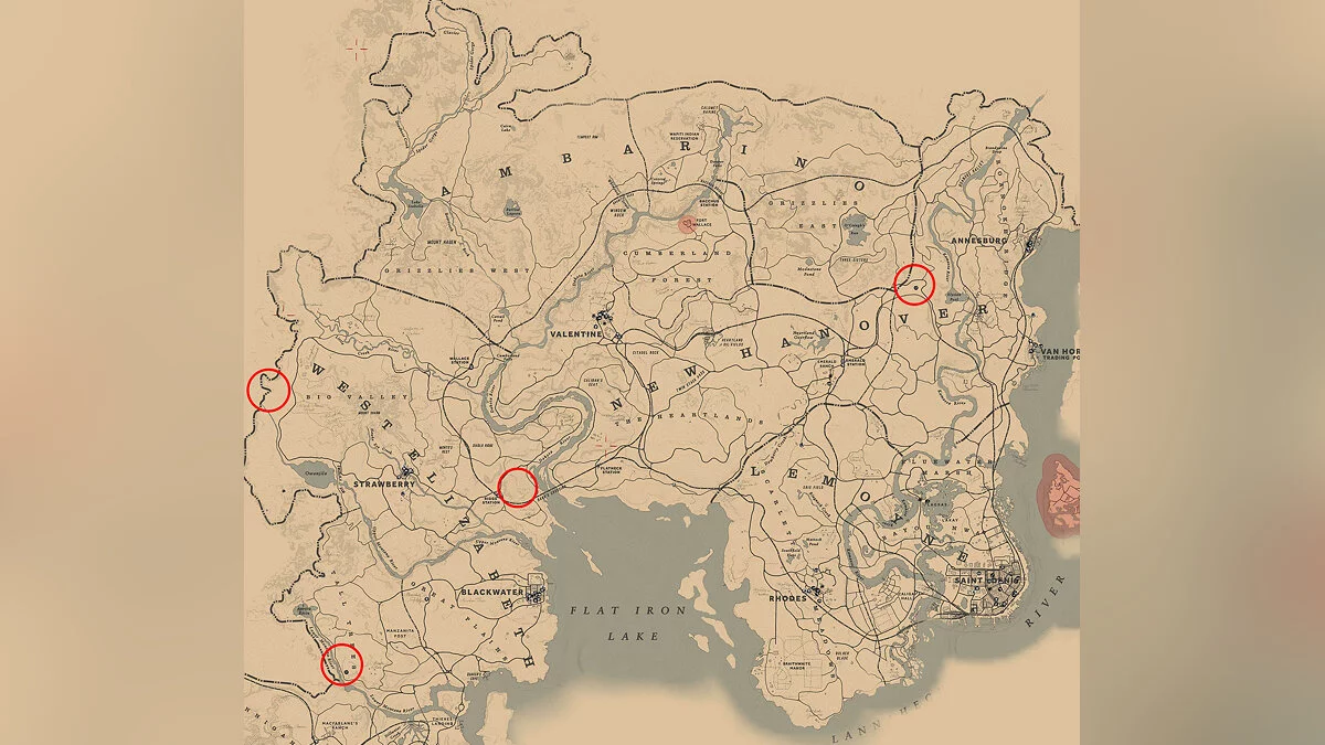 Обычно охотника можно найти в Сен-Дени (Saint Denis). Он находится на юго-востоке города, на рынке. После этого он может быть в одном из мест, отмеченных на карте ниже. Первое место находится к северу от Сен-Дени (Saint Denis), к западу от Елисейского пруда (Elysian Pond), прямо перед пересечением с железной дорогой. Следующее находится к востоку от Стробери (Strawberry), до реки Дакота (Dakota River). Еще одно место на западном краю карты, западнее Большой долины (Big Valley). Последнее — к западу от Причалов Воров (Thieves’ Landing), вдоль реки.