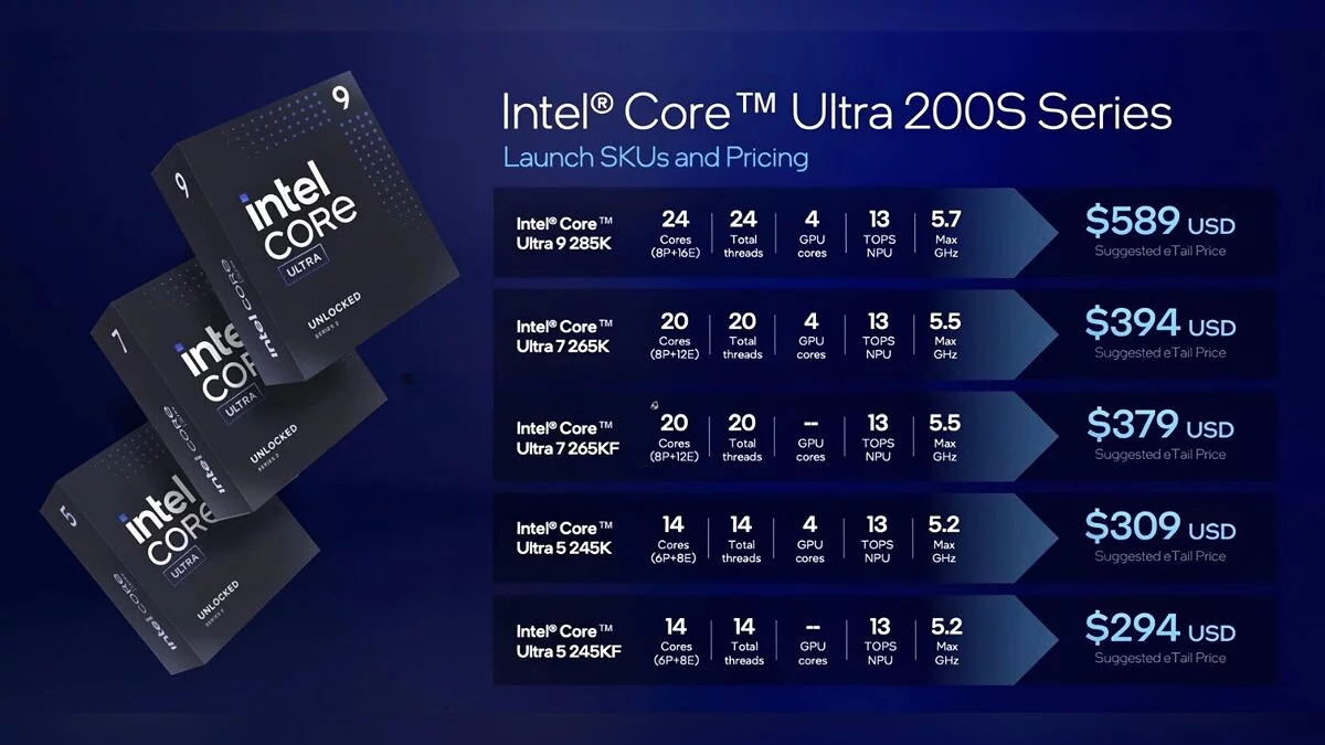 Intel офіційно представила серію настільних процесорів Core Ultra 200S, також відому як Arrow Lake-S. Нове покоління чіпів включає п'ять моделей, три з яких (версії з індексом K) оснащені вбудованою графікою. Всі процесори отримали нейронний модуль, що дозволяє ефективно вирішувати завдання, пов'язані з штучним інтелектом.
