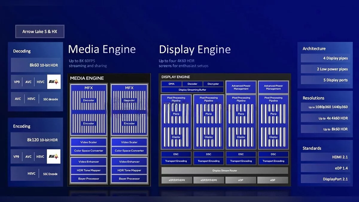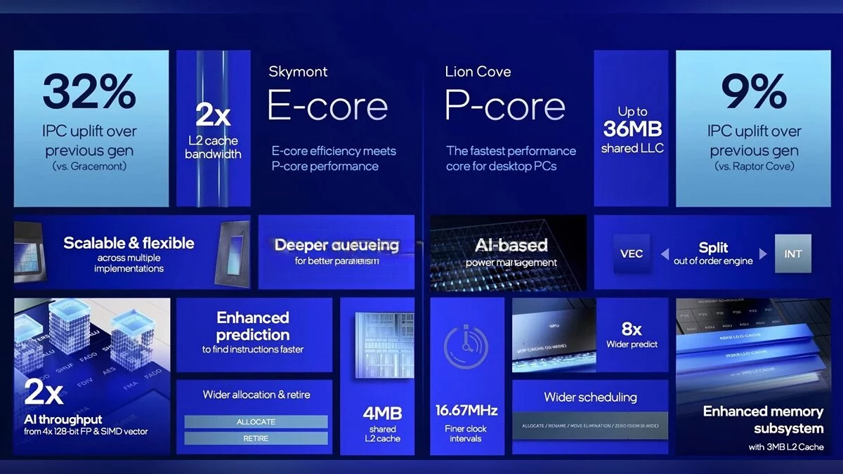 Нова лінійка побудована на базі високопродуктивних ядер Lion Cove та енергоефективних Skymont, що обіцяє значні поліпшення в порівнянні з попереднім поколінням Raptor Lake. Ядра Lion Cove забезпечують на 9% більше інструкцій за такт (IPC) у порівнянні з Raptor Cove, в той час як ядра Skymont пропонують приріст у 32% у порівнянні з Gracemont. Інтегрована графіка побудована на архітектурі Alchemist, що дозволяє вирішувати повсякденні завдання, підтримуючи DirectX 12 Ultimate та технології трасування променів. Продуктивність вбудованого ІІ становить до 8 TOPS, а нейронний модуль (NPU) забезпечує 13 TOPS, що робить ці процесори конкурентоспроможними для завдань зі штучним інтелектом.