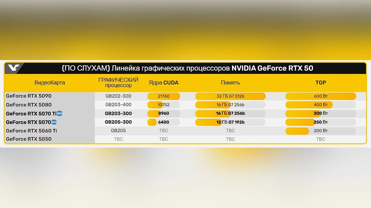 Додатково видання підтвердило, що GeForce RTX 5070 Ti буде оснащена графічним процесором GB203-300 і 8 960 ядрами CUDA. Модель з'явиться на ринку з 16 Гб пам'яті GDDR7. Модель GeForce RTX 5070 буде на базі графічного процесора GB205 з 6 400 ядрами CUDA і 13 Гб пам'яті GDDR7. Енергоспоживання обох карт складе 300 і 250 Вт відповідно.