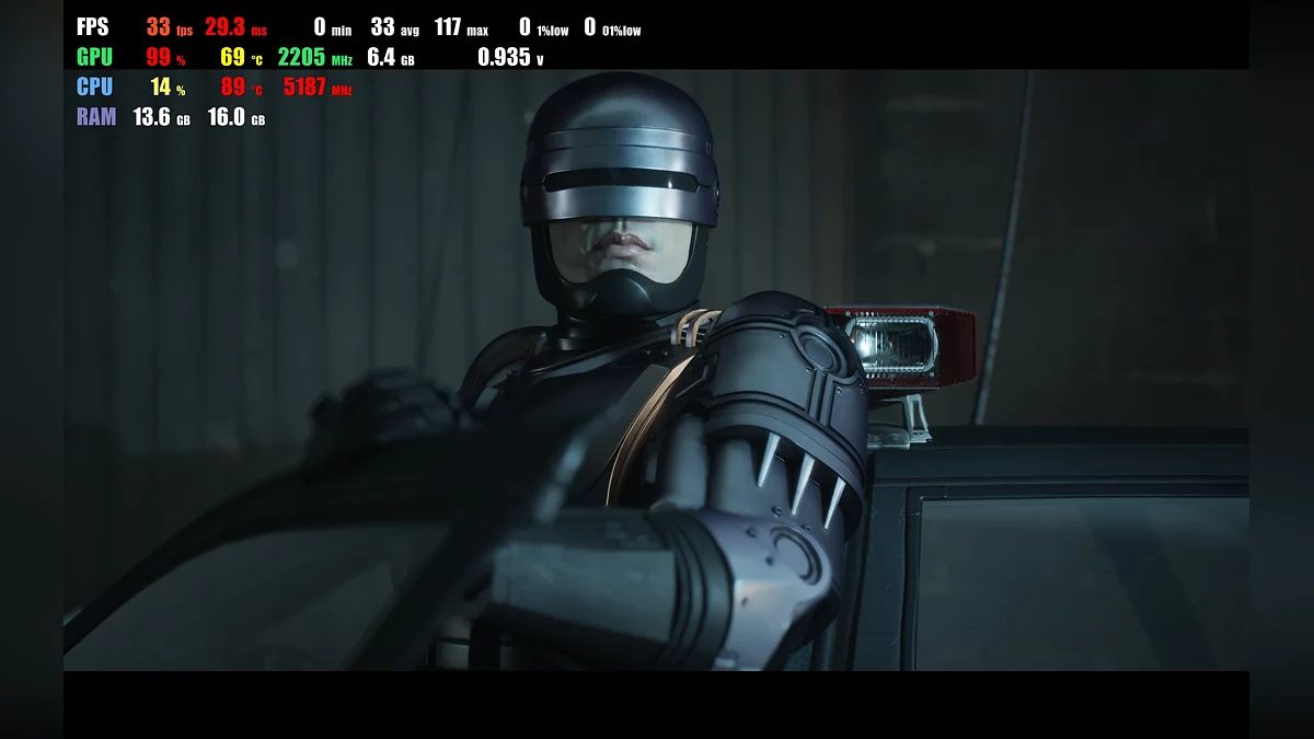 RoboCop: Rogue City. Гра демонструє близько 40 FPS при ультра-налаштуваннях, тому в гонитві за 60 FPS і плавною картинкою знадобиться знизити роздільну здатність до Full HD.