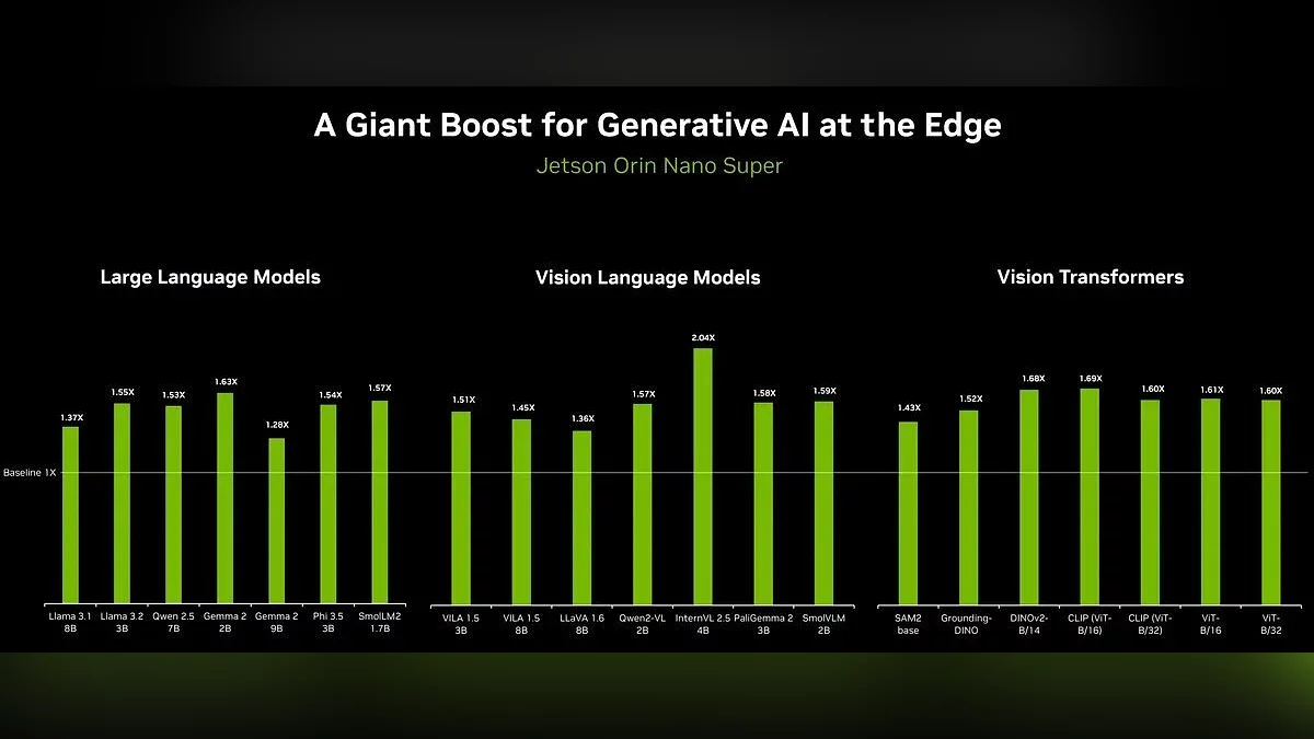 Jetson Orin Nano Super оснащений шестиядерним процесором Arm Cortex-A78AE з частотою 1,7 ГГц, 8 Гб оперативної пам'яті та графічним чіпом з 1024 ядрами CUDA і 32 тензорними ядрами, що працюють на частоті 1020 МГц. Максимальна продуктивність новинки досягає 67 TOPS.
