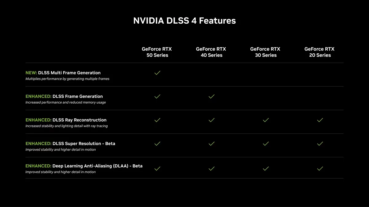 DLSS 4 в повному обсязі (з усіма нововведеннями) отримають відеокарти RTX 50. Попередні покоління отримають підтримку технології з обмеженим функціоналом.