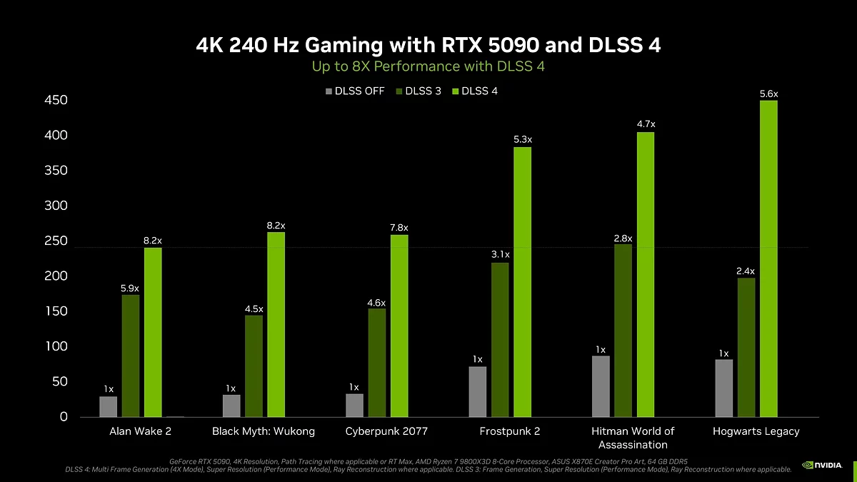Наприклад, у Hogwarts Legacy кількість FPS завдяки включенню функції DLSS 4 може збільшитися в 5,6 разів.