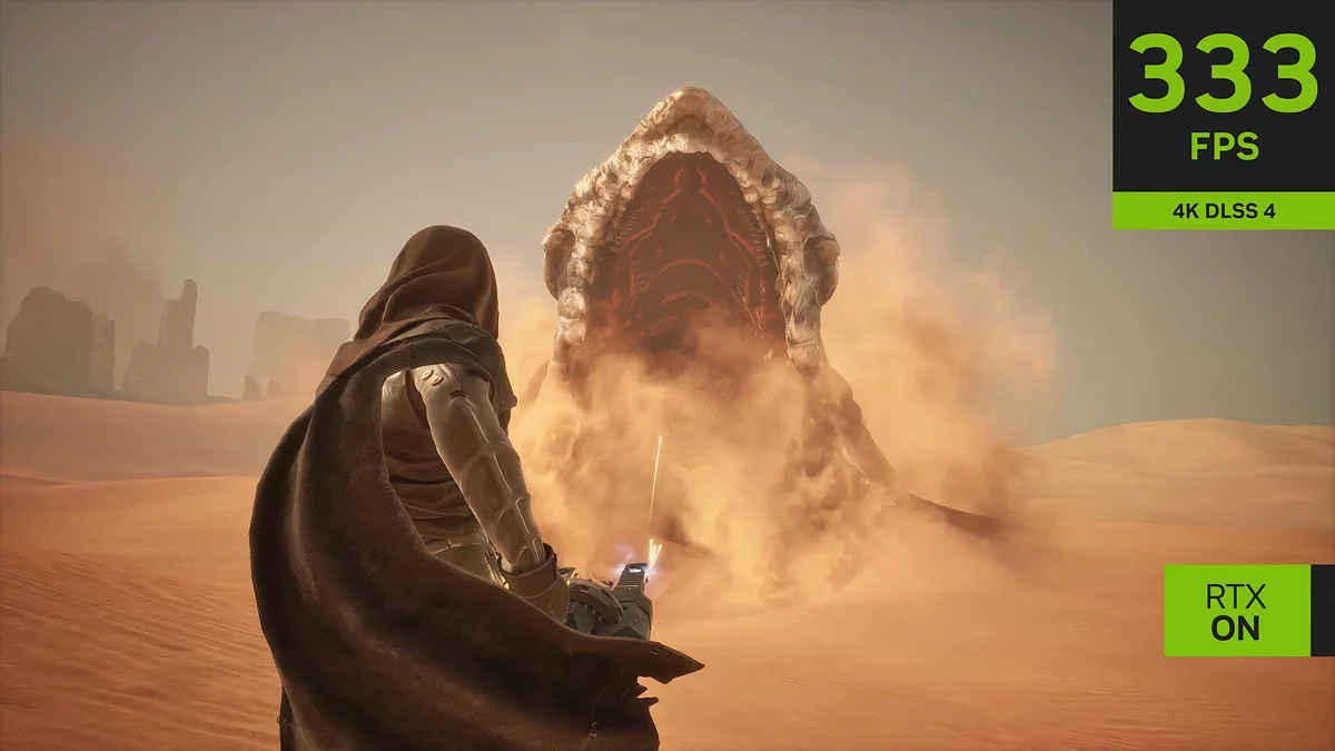 NVIDIA вже опублікувала відео, на якому показала, як DLSS 4 підвищує продуктивність у Dune: Awakening, що працює на системі з відеокартою RTX 5090. Середня частота кадрів склала 250-300 FPS.