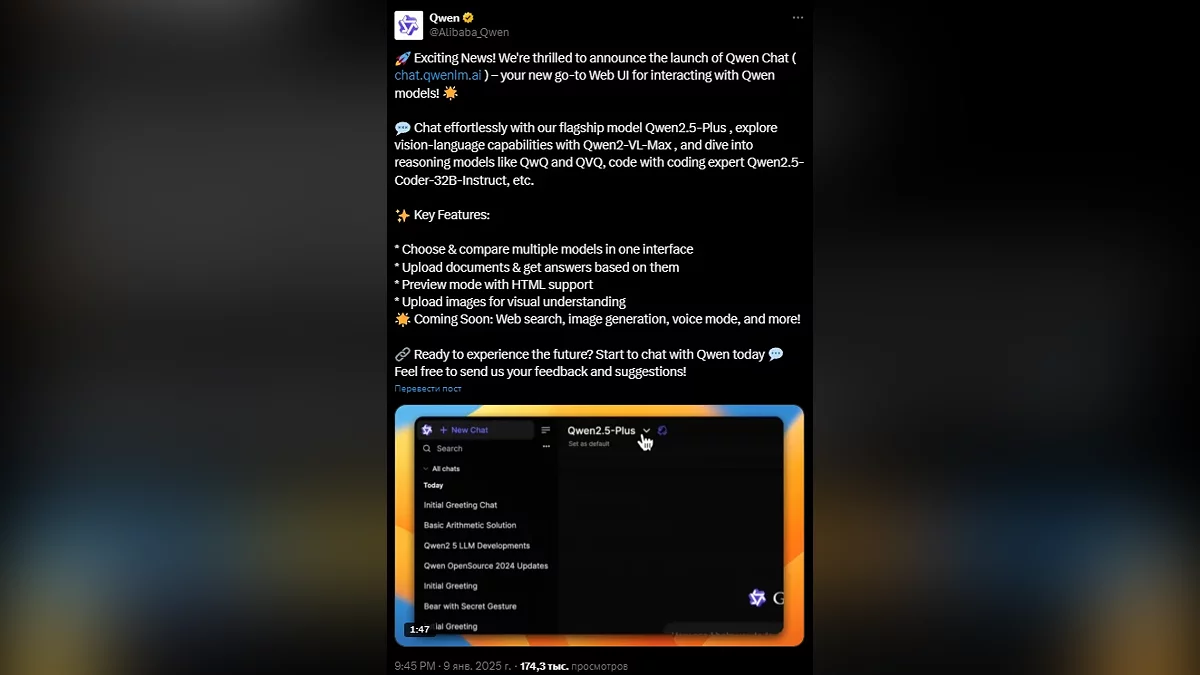 На вибір у відвідувачів є кілька моделей, включаючи дві з розпізнаванням зображень. На жаль, генерації картинок немає (планується додати пізніше), але зате можна завантажити документ для аналізу, перекласти текст, знайти інформацію в Інтернеті, порівняти відповіді різних моделей для більш точної видачі і навіть написати код. Сервіс все ще доопрацьовується, тому можуть бути помилки. У майбутньому для Qwen Chat мають намір реалізувати веб-пошук, голосовий режим і інші корисні функції.