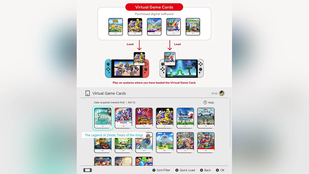 - Можна «вставляти» і «виймати» віртуальні картриджі між двома системами Switch;