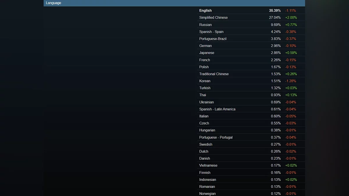 Найпопулярнішою мовою знову став англійський — 35,39%. Але його частка скоротилася в квітні на 1,11%. Після нього йдуть спрощений китайський (27,04%) і російський (9,69%).