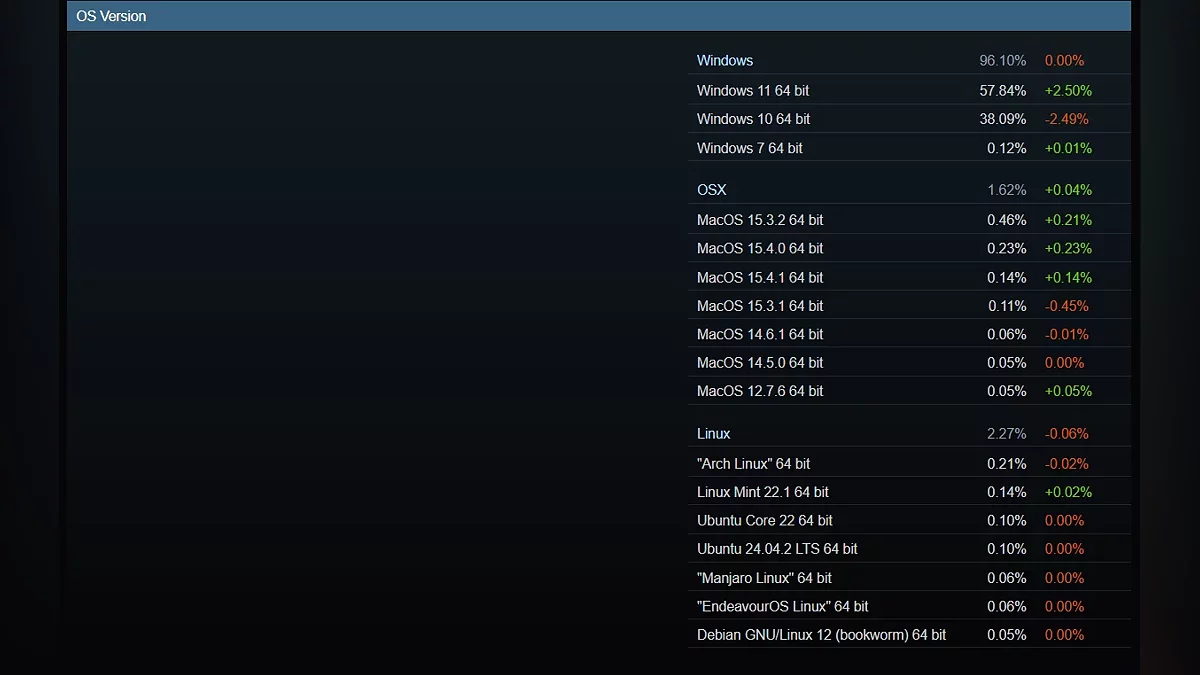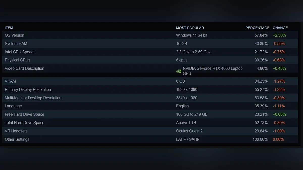 Windows 11 64 bit збільшила свою частку серед користувачів Steam на 2,50% (57,84% в цілому). Windows 10 64 bit використовують 38,09% геймерів, а Windows 7 64 bit — 0,12%.