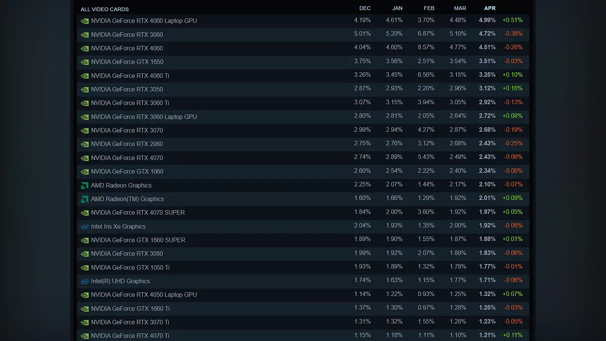 Цього разу на першому місці серед «народних» відеокарт лептоп-версія NVIDIA GeForce RTX 4060. На неї припадає 4,99% користувачів. Наступними йдуть NVIDIA GeForce RTX 3060 (4,72%) і десктопна NVIDIA GeForce RTX 4060 (4,51%).