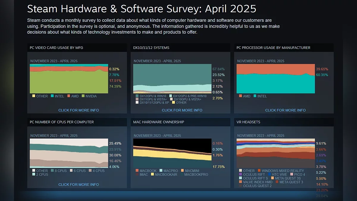 В Steam підвели підсумки квітневого опитування серед користувачів цього сервісу. Завдяки цьому стало відомо, які в основному відеокарти використовують геймери. За словами Valve, зібрана інформація допомагає зрозуміти, які технології слід розвивати і які продукти пропонувати користувачам.