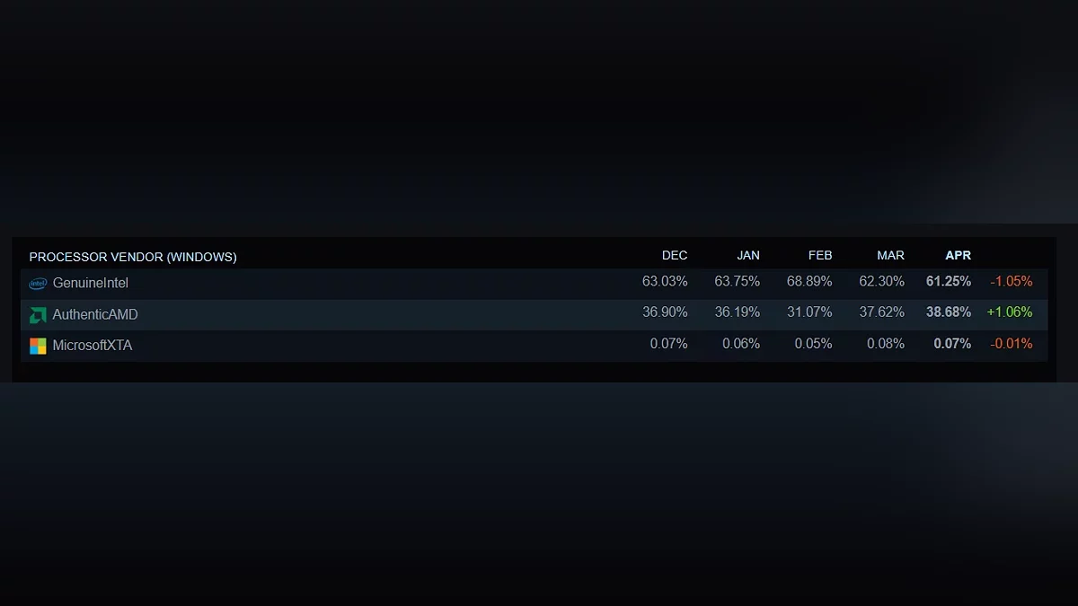 Серед процесорів лідерство знову у Intel. Проте частка AMD у квітні зросла на 1,06% і зараз становить 38,68% (проти 61,25% у Intel).
