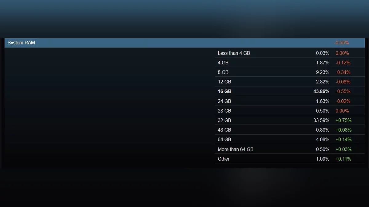 Що стосується ОЗУ, то у 43,86% користувачів встановлено на ПК 16 ГБ оперативної пам'яті. 32 ГБ використовують 33,59%.