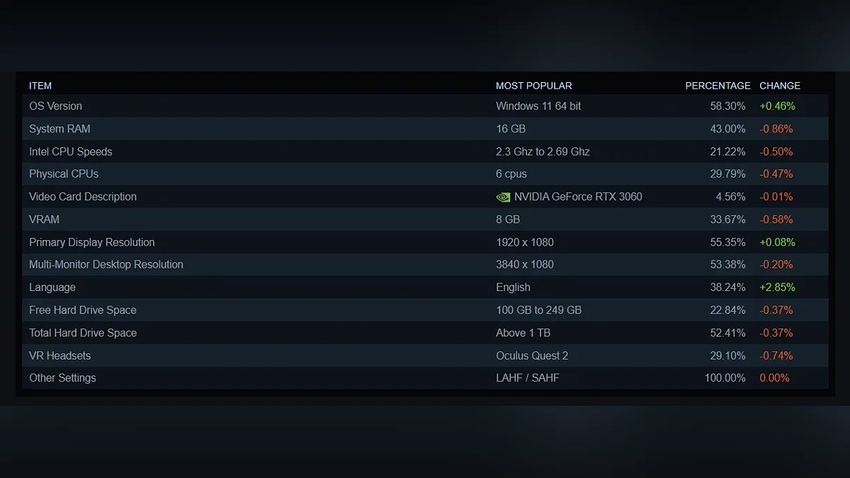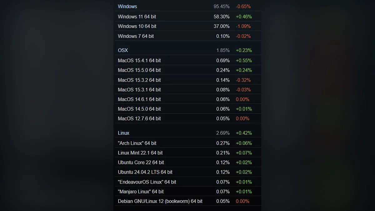 Найпопулярнішою ОС досі є Windows 11 64 bit. Її використовують 58,30% користувачів Steam.