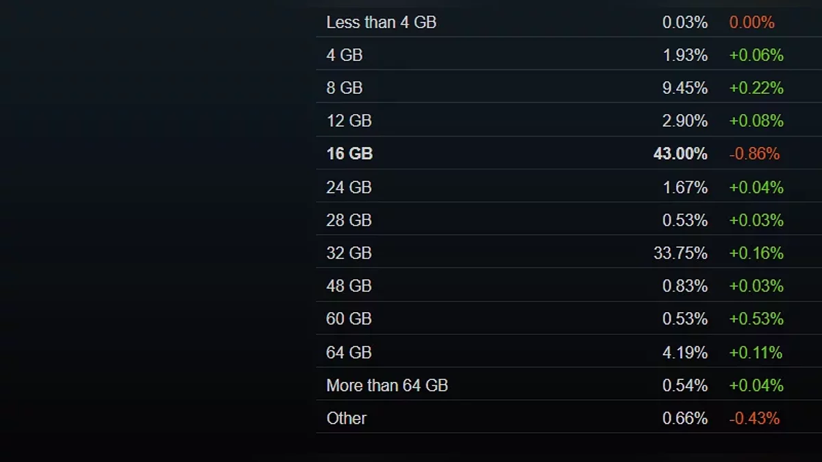 У більшості геймерів (у 43,00%) на PC встановлено 16 ГБ ОЗУ. У свою чергу, 32 ГБ використовують 33,75% користувачів.
